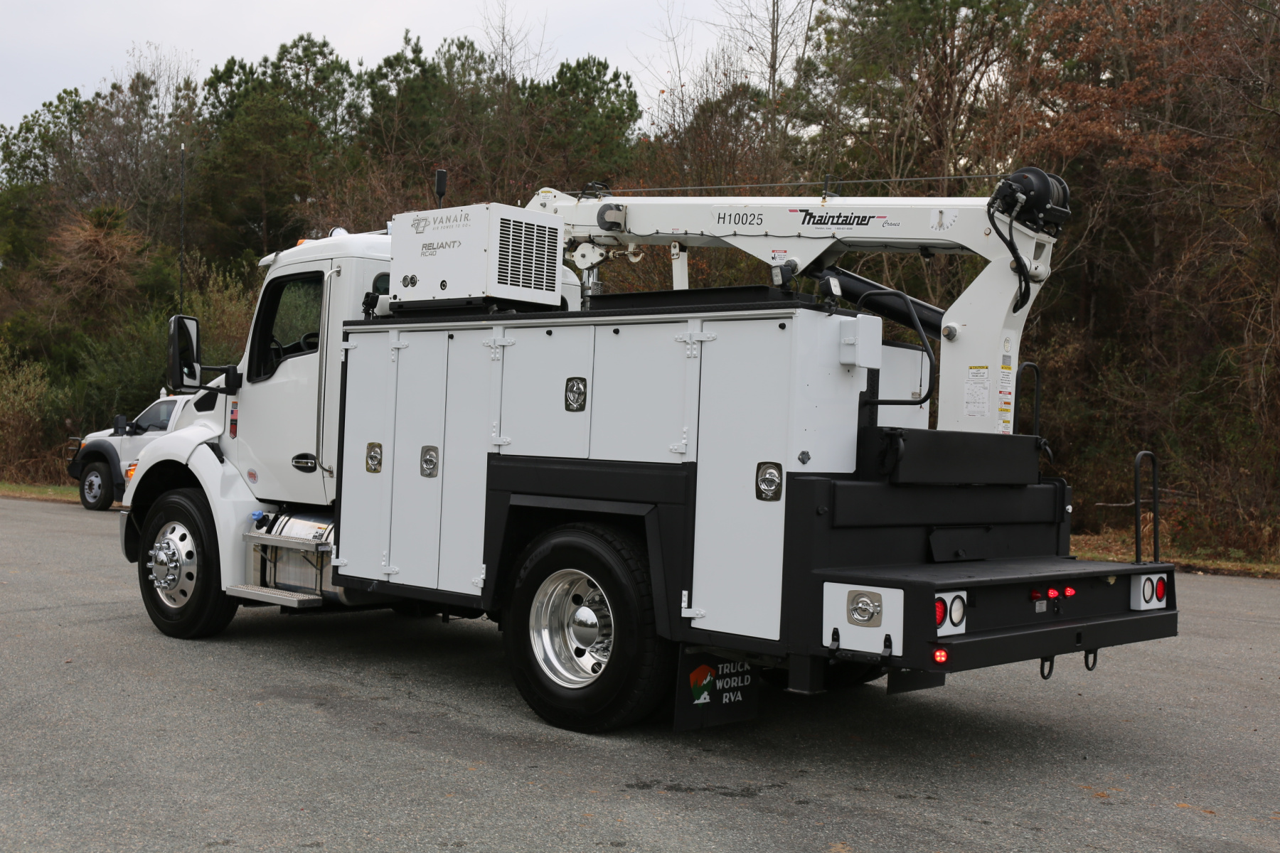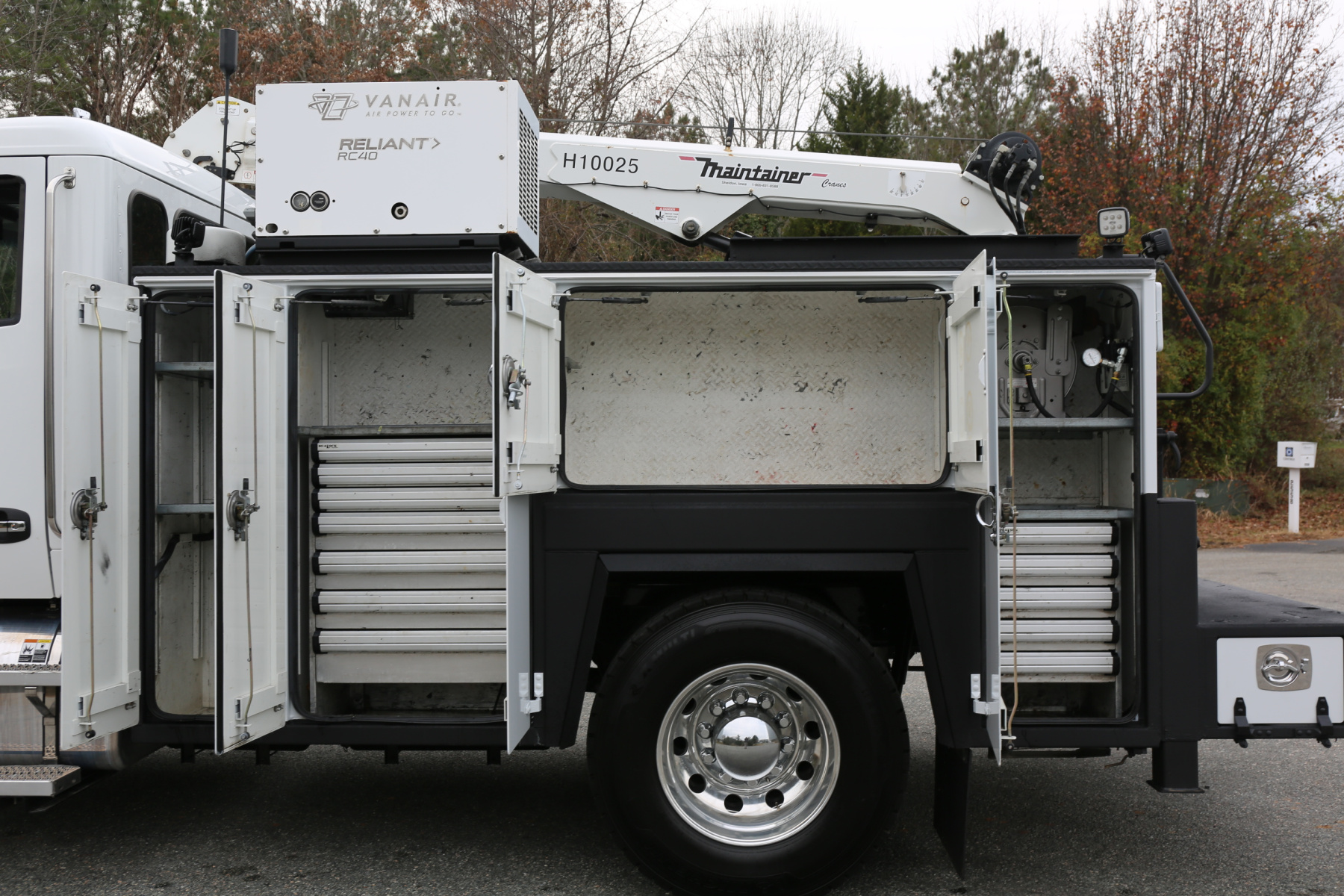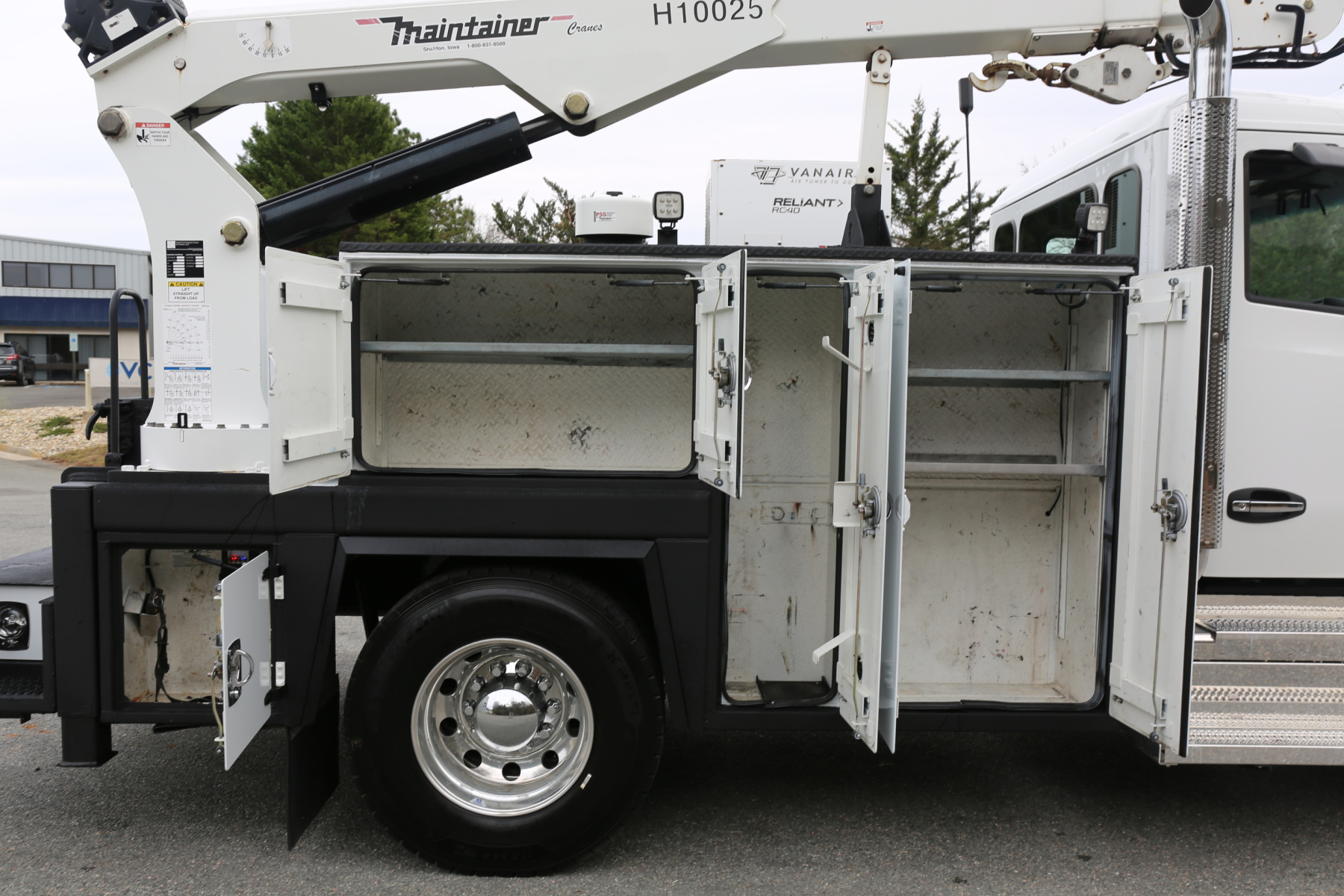 Equipped with a 2018 year model Maintainer service body, a Maintainer 100025 series crane, a Vanair RC40 hydraulic compressor, two sets of drawers, and hydraulic outriggers.