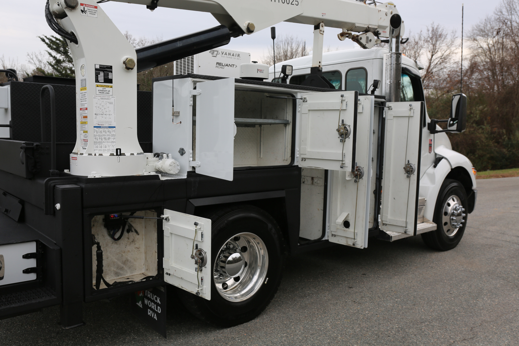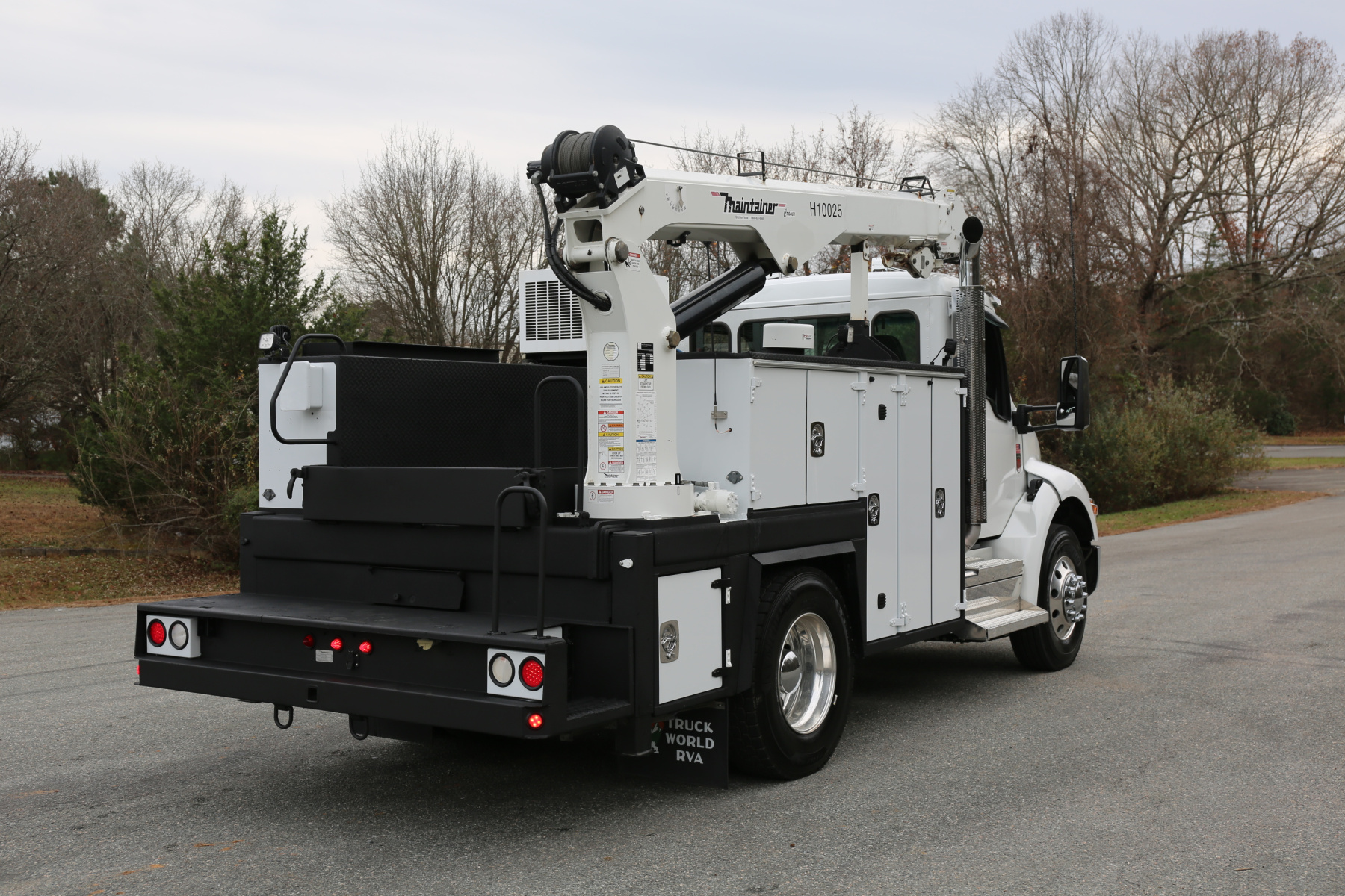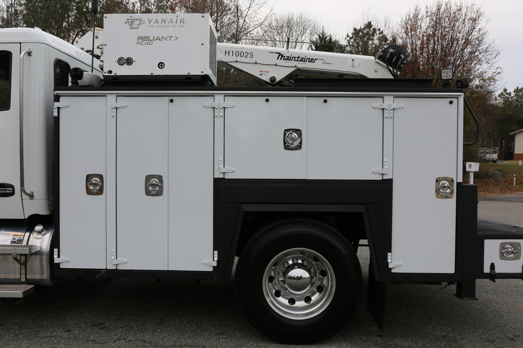 Equipped with a 2018 year model Maintainer service body, a Maintainer 100025 series crane, a Vanair RC40 hydraulic compressor, two sets of drawers, and hydraulic outriggers.