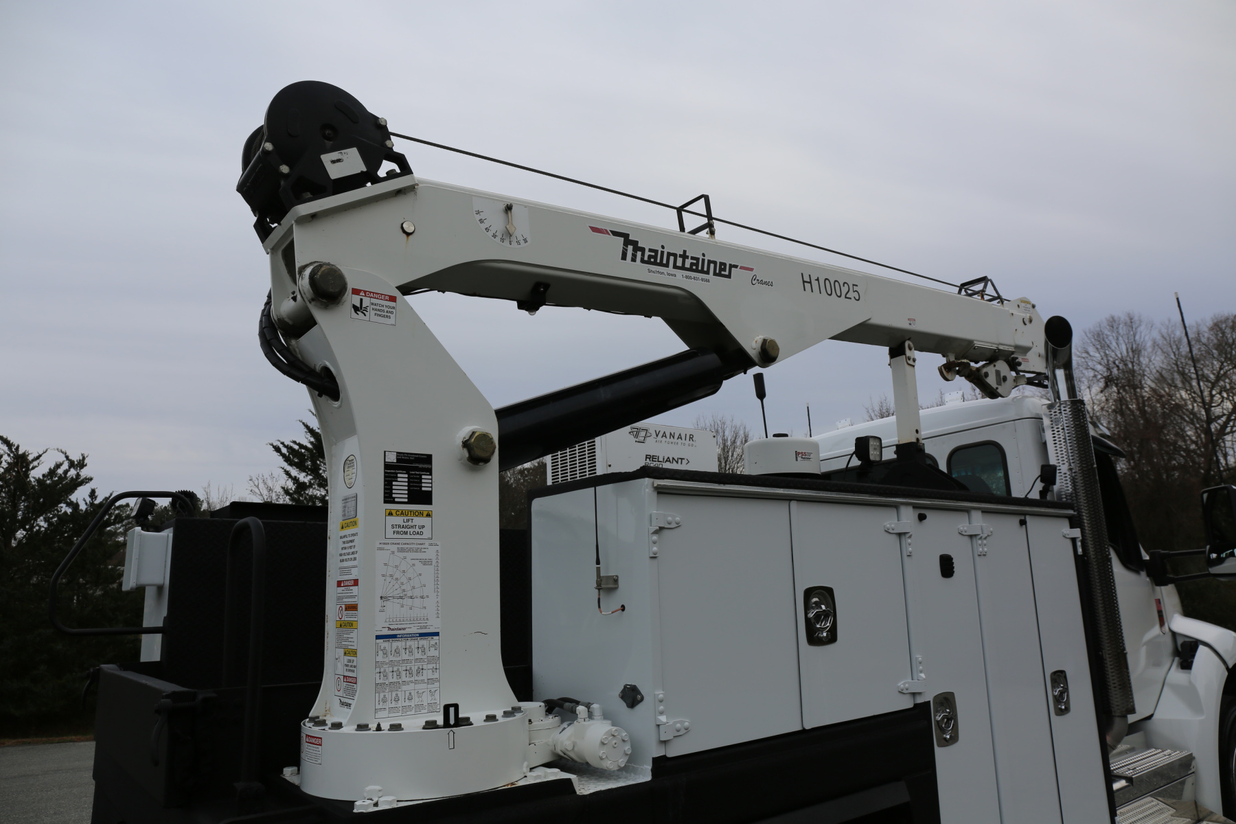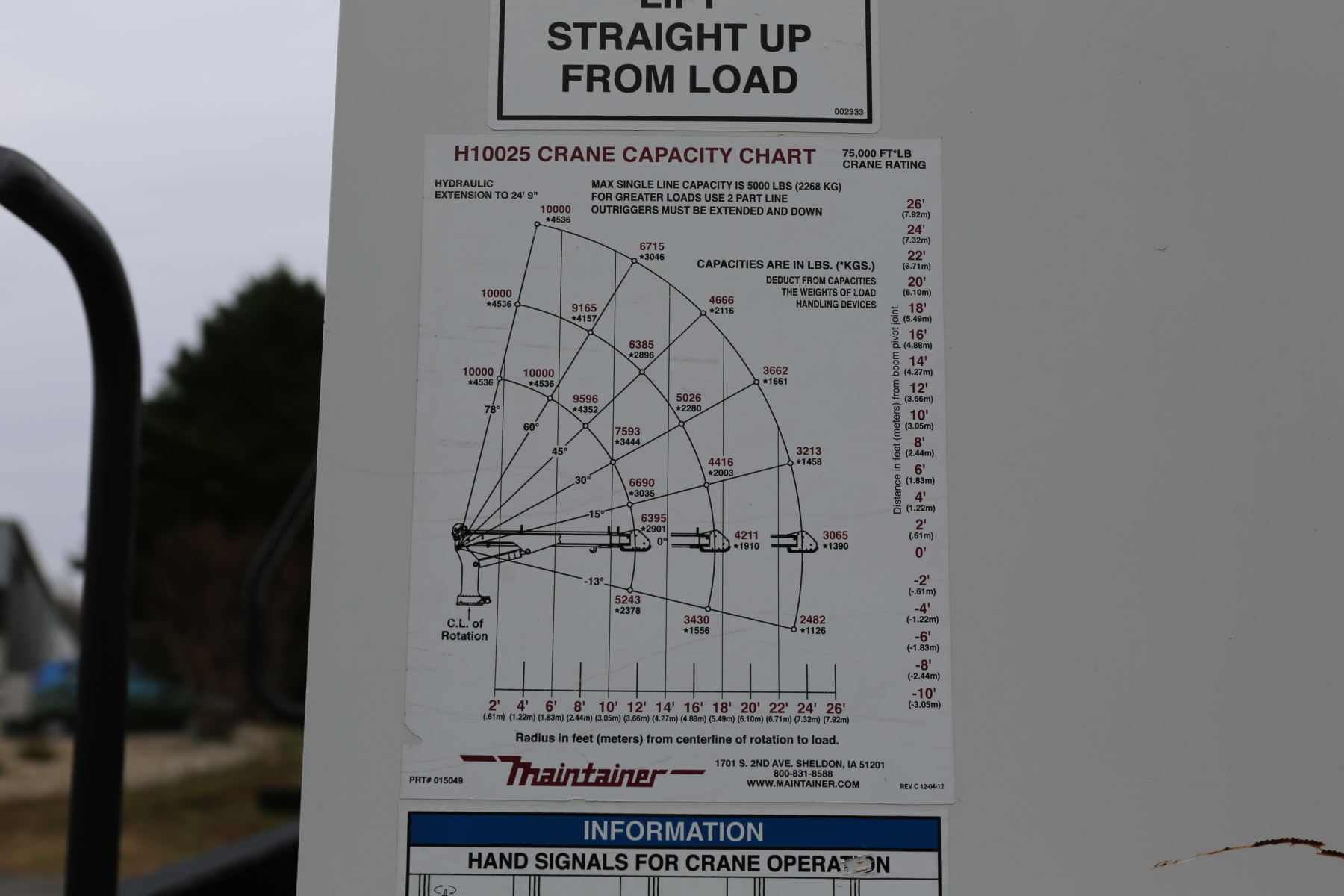 The crane is a Maintainer H10025 series crane, with a 10,000# maximum lifting capacity and a two stage extension out to 25′ of total reach. Run off a factory wireless remote.